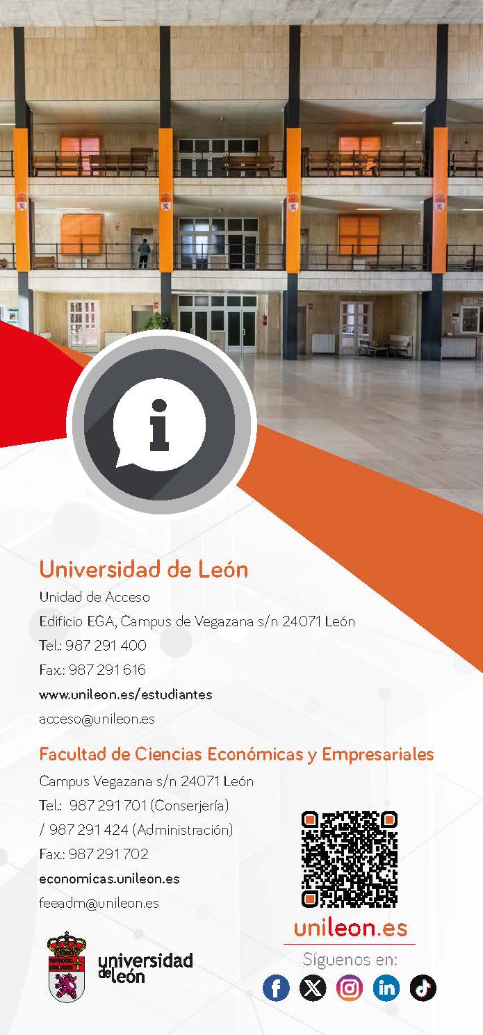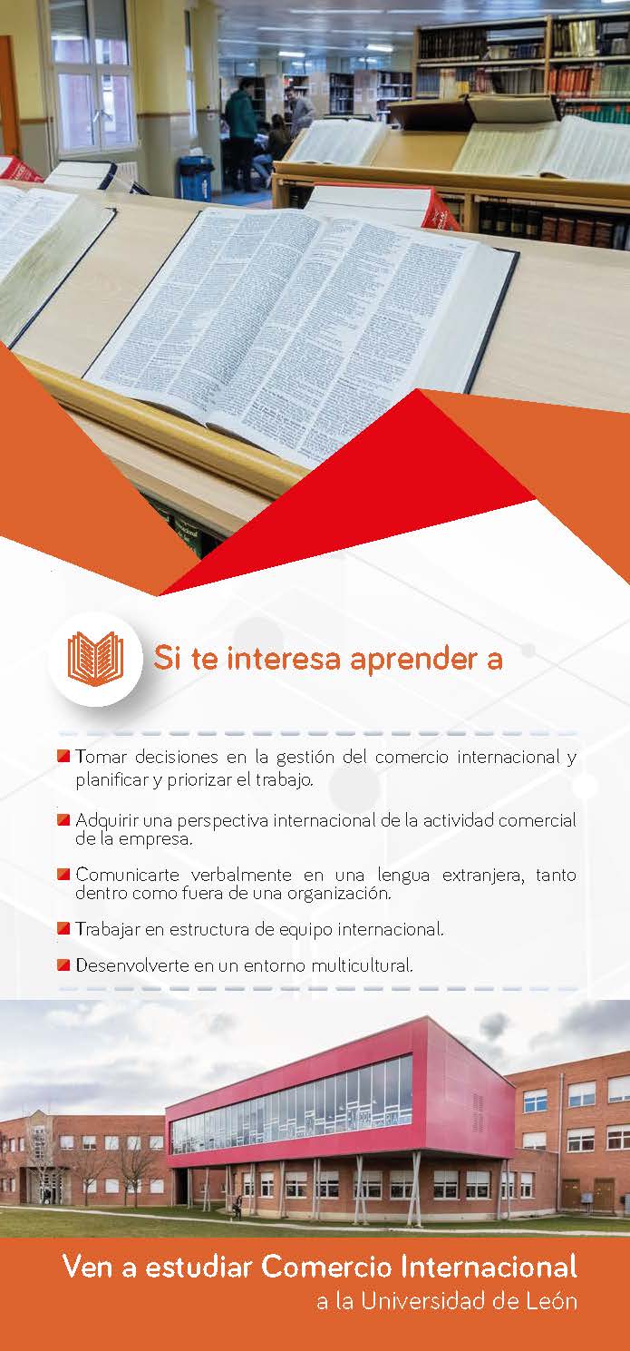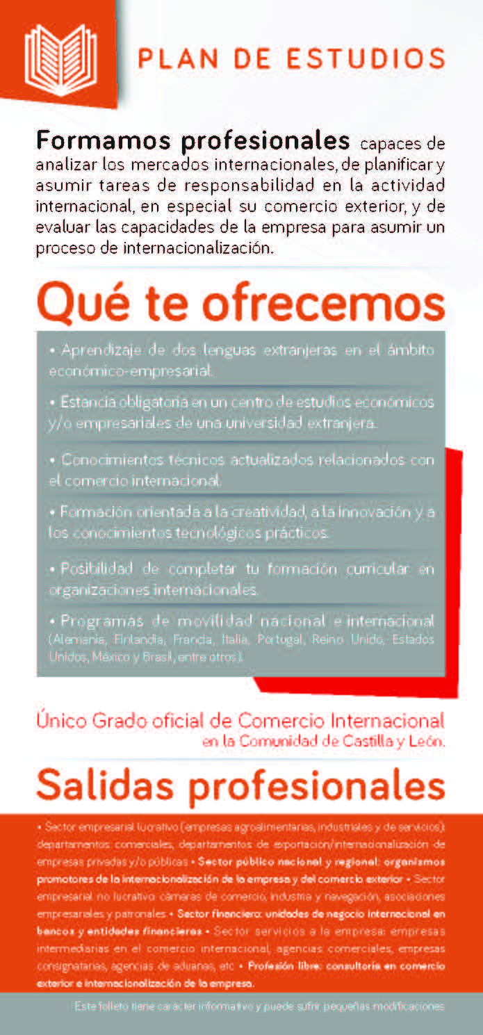 Coordinador del Título de Grado: Pablo Gutiérrez Rodríguez (pablo.gutierrez@unileon.es) ~ Despacho nº 172 Coordinadores de curso Curso 1º: Yolanda Fernández Santos ~ Despacho nº 155 Curso 2º: Mario Díaz Martínez ~ Despacho nº 98 Curso 3º: Nuria González Rabanal ~ Despacho nº 128-A Curso 4º: Rosana Fuentes Fernández ~ Despacho nº 165 Comisión de Coordinación Grado en Comercio Internacional Resolución 9329 ( BOE 127, 28 mayo 2011)| Tríptico Informativo | Degree in International Trade (GCI) |